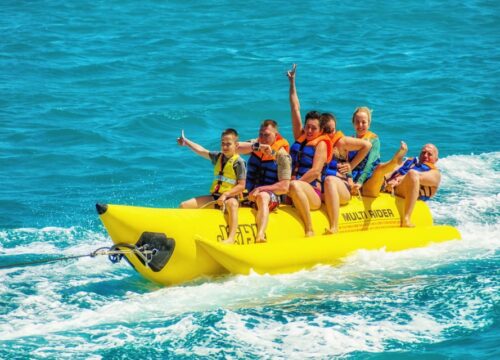 But the fun doesn’t stop there! After your parasailing experience, it’s time to dive into the world of exciting water games. First, you’ll enjoy a hilarious and bumpy ride on the Banana Boat — a long inflatable banana-shaped float pulled by a speedboat, designed to make you laugh, splash, and possibly even fall into the sea. After that, hold on tight for the Tuba ride, another thrilling inflatable water ride that tests your balance and adds more adrenaline to your day.